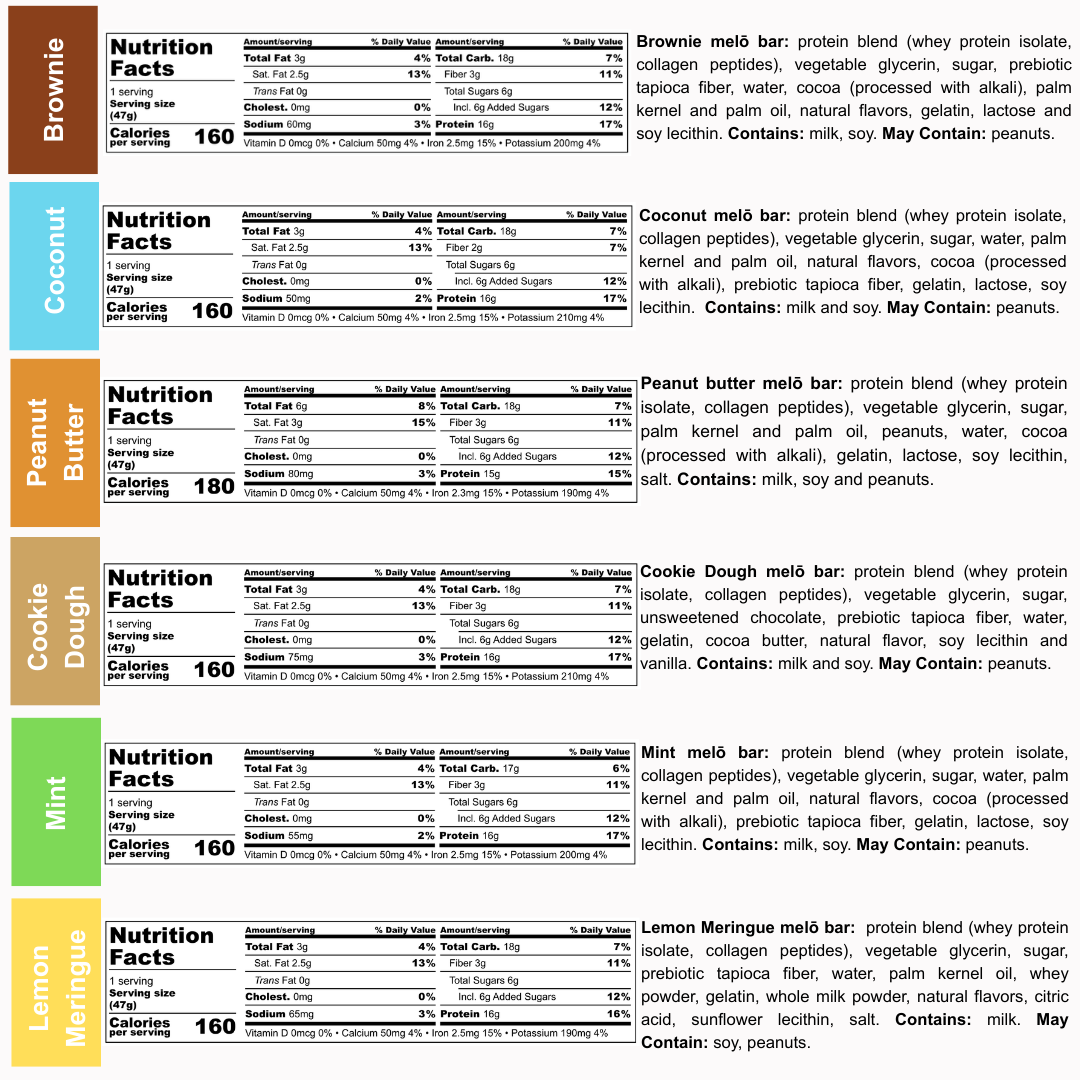 Peanut butter melō bar: protein blend (whey protein isolate, collagen peptides), vegetable glycerin, sugar, palm kernel and palm oil, peanuts, water, cocoa (processed with alkali), gelatin, lactose, soy lecithin, salt.
